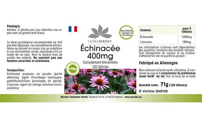 Echinacea purpurea in polvere (parte fuori terra), agente di rivestimento idrossipropilmetilcellulosa (involucro della capsula), L-Leucina, agente di carica cellulosa microcristallina