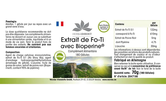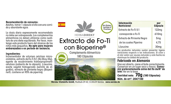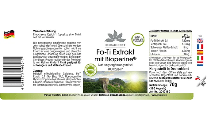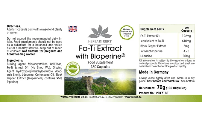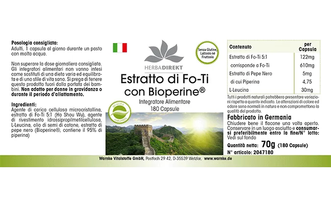 Agente di carica cellulosa microcristallina, estratto di Fo-Ti 5:1 (He Shou Wu), agente di rivestimento idrossipropilmetilcellulosa (involucro della capsula), L-Leucina, olio di semi di cotone, estratto di pepe nero (Bioperine®, contiene il 95% di piperina)