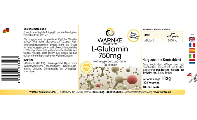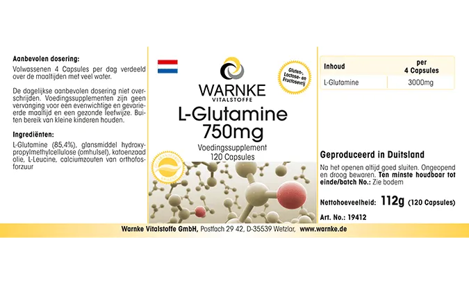 L-Glutammina (85,4%), agente di rivestimento idrossipropilmetilcellulosa (involucro della capsula), L-Leucina, olio di semi di cotone, sali di calcio dell’acido ortofosforico