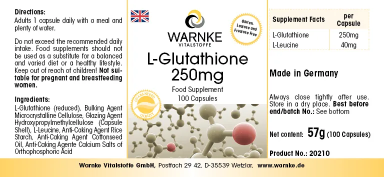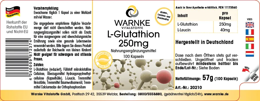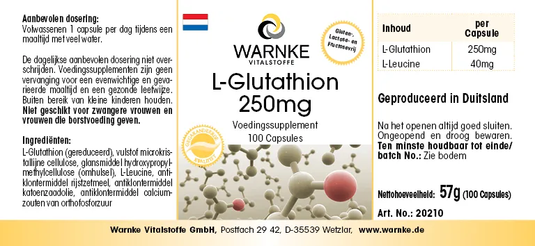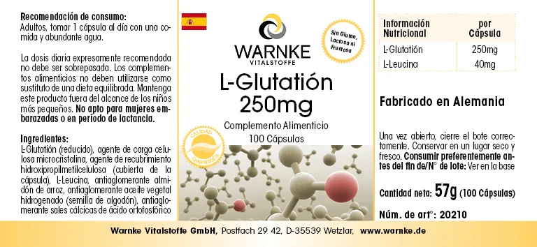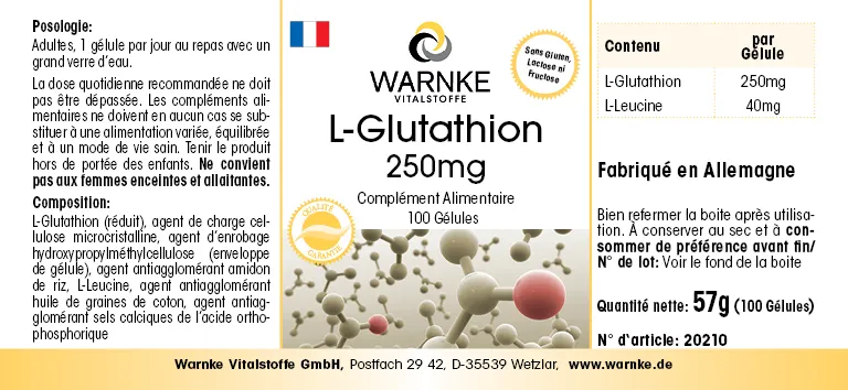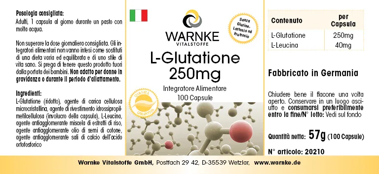 L-Glutatione (ridotto), agente di carica cellulosa microcristallina, agente di rivestimento idrossipropil- metilcellulosa (involucro della capsula), L-Leucina, agente antiagglomerante miscela di estratti di riso, agente antiagglomerante olio di semi di cotone, agente antiagglomerante sali di calcio dell’acido ortofosforico