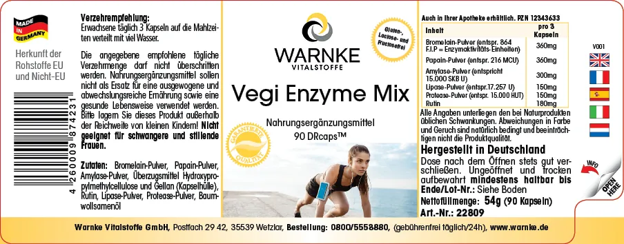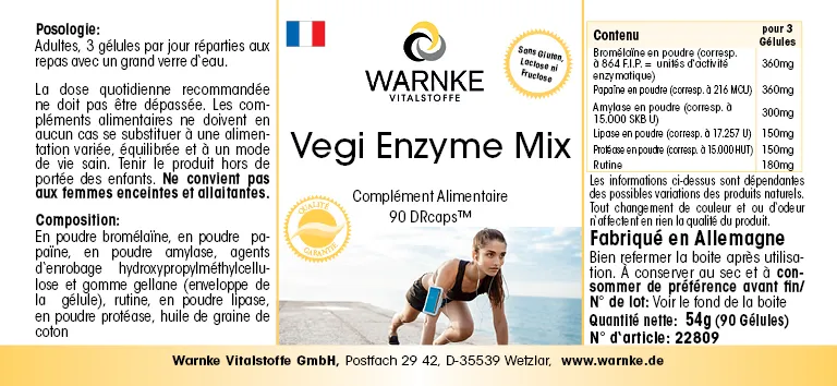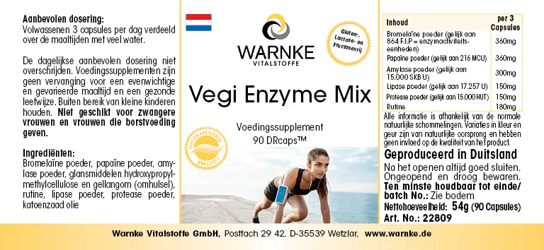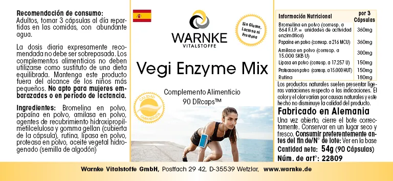 Bromelina in polvere, papaina in polvere, amilasi in polvere, agente di rivestimento idrossipropilmetilcellulosa (involucro della capsula), agente di rivestimento gomma di gellano (involucro della capsula), rutina, lipasi in polvere, proteasi in polvere, agente antiagglomerante sali di magnesio degli acidi grassi