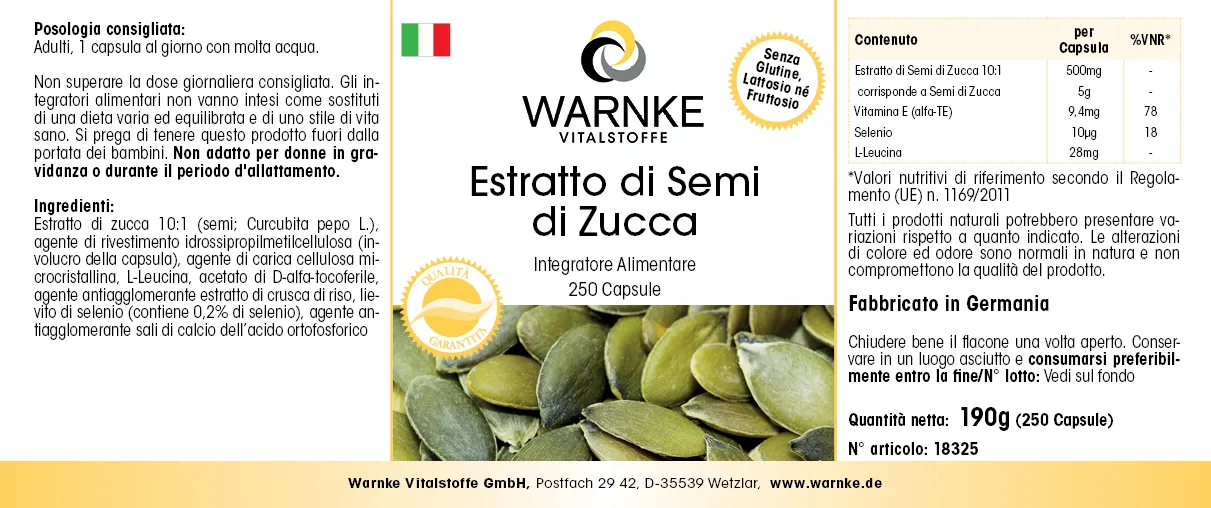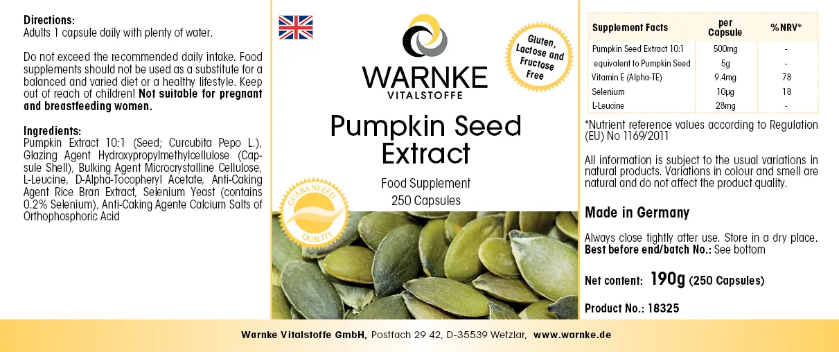 Pompoenpitextract (Cucurbita pepo L., 10:1), coatingmiddel hydroxypropylmethylcellulose (capsuleomhulsel), vulstof microkristallijne cellulose, L-leucine, D-alfa-tocoferylacetaat, extract van rijstzemelen, seleniumgist (bevat 0,2 % seleen)